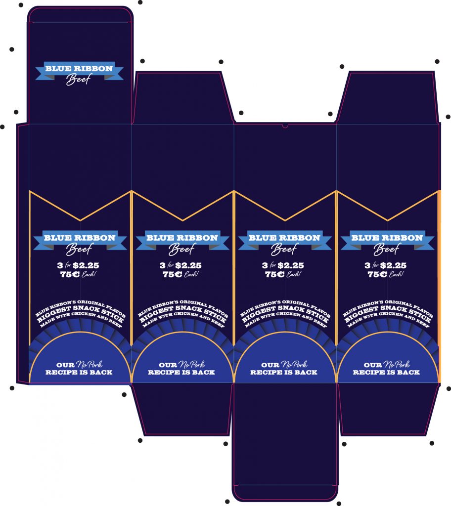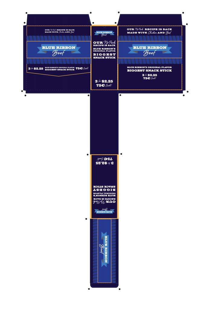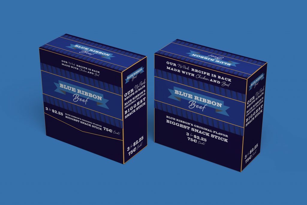 The total rebrand, Blue Ribbon Beef, positions the brand in a new updated and premium way. This concept was founded on the idea that the Blue Ribbon Beef jerky snack sticks are created from high quality, top of the line beef. I really wanted to capture that award winning feeling in the rebrand design.