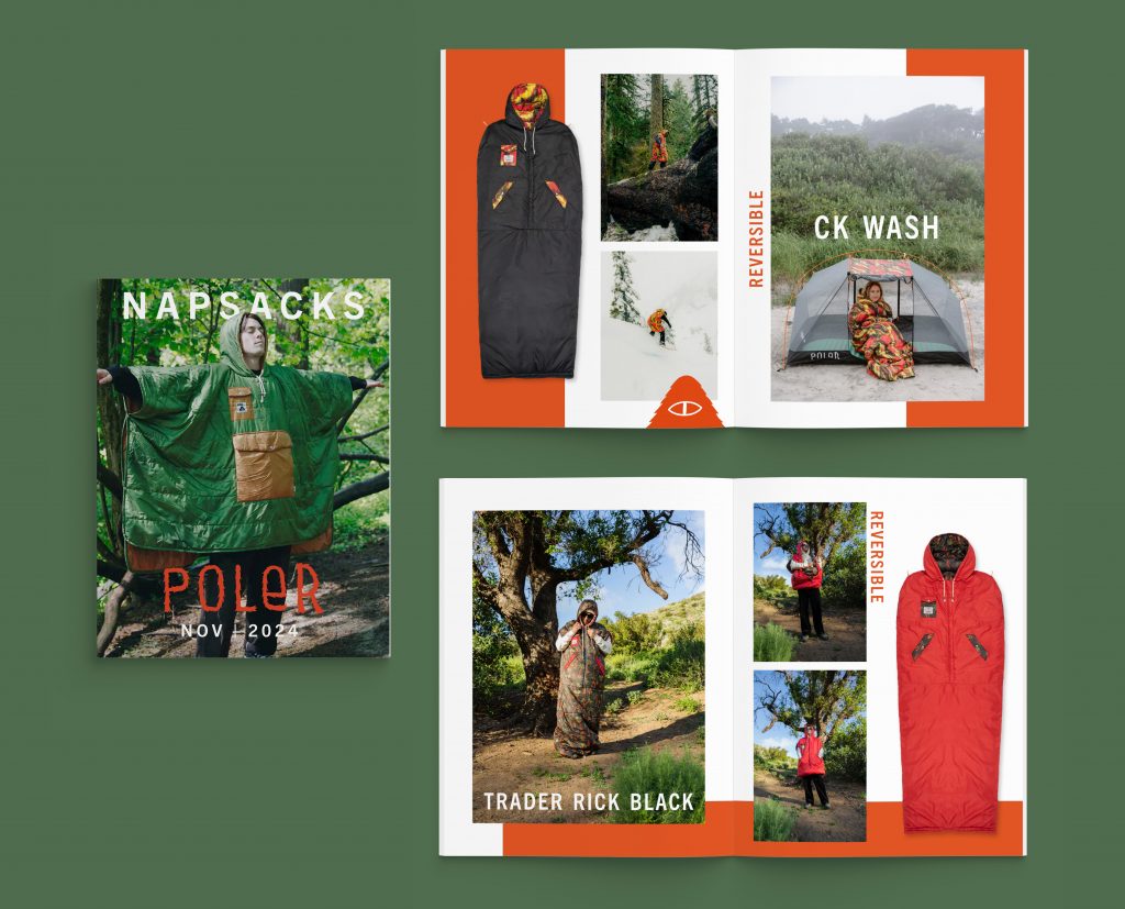 For this project, I created a look book for the brand Poler. The goal was to capture the brand aesthetic and brand voice, and translate that onto a physical printed medium. Poler is known for their napsacks, a fun camping invention that is totally unique to the Poler brand. So what better way to portray that brand by bringing the napsack to the forefront and putting a spotlight on this innovative product. The images on each spread were chosen specifically, as to further display the functionality of Poler napsacks in an outdoor environment.