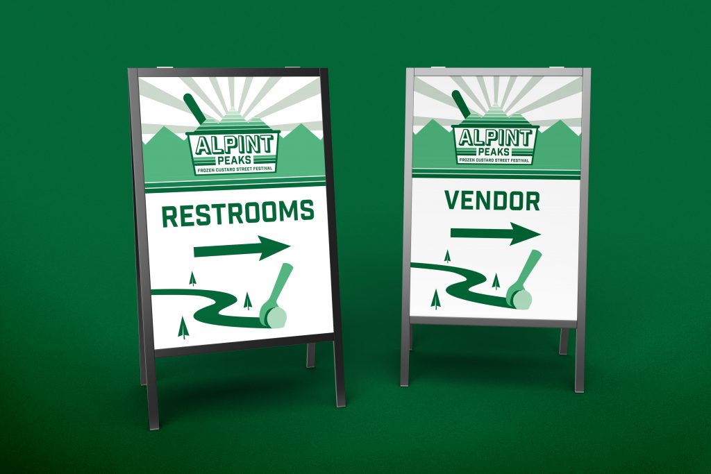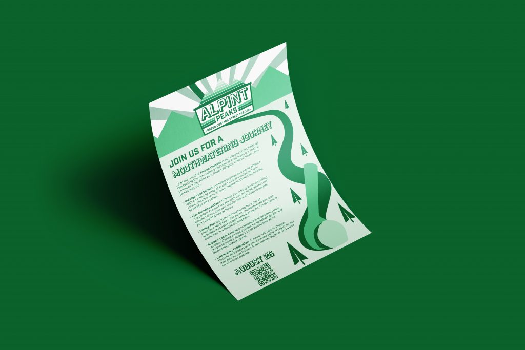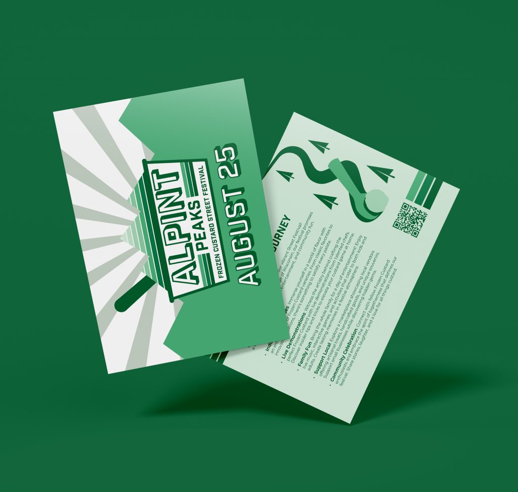 The name for the festival would be Alpint Peaks Frozen Custard Street Festival. For the concept aesthetic, I wanted to create a retro feel with “alpine” and green forest inspiration. This retro aesthetic gives the viewer a feeling of nostalgia, taking you back to a time where frozen custard was really integrating itself into Milwaukee culture.